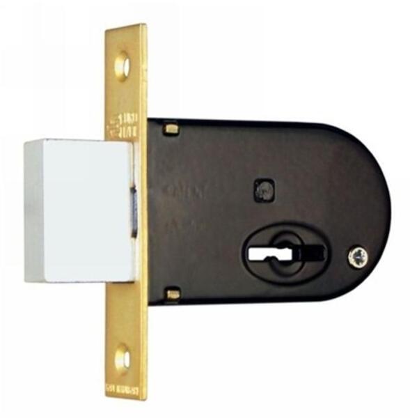 Kétcsukású bevéső reteszzár, kéttollú kulccsal. Kivitel: előlap: horganyzott sárga, szekrény: festett fekete.
